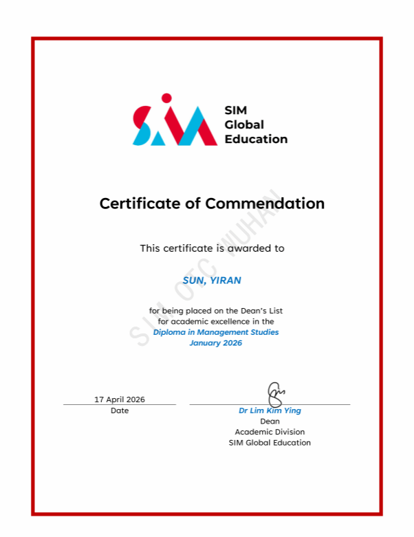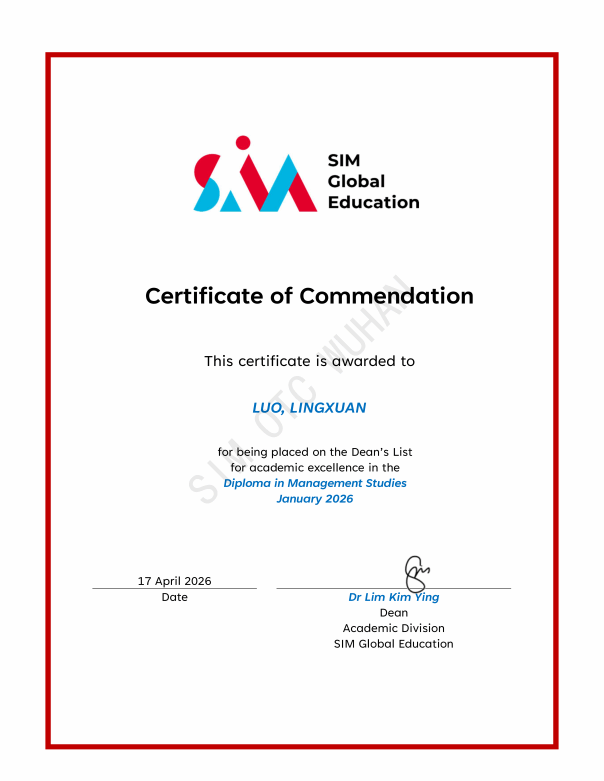 (通讯员 谢蕾)近日,新加坡管理学院(SIM)传来喜讯:SIM 国际大一项目24级两名学子罗翎瑄等,凭借优异的学业成绩与突出的综合表现,成功入选院长名单(Dean’s List),荣获该项象征学术卓越的重要荣誉,充分展现了国际项目学子扎实的专业素养与良好的精神风貌。